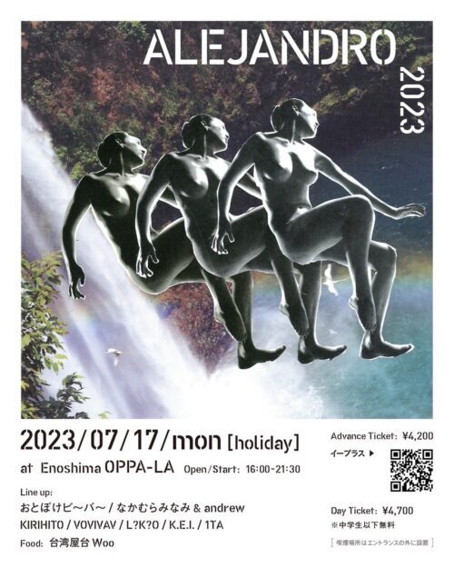 Past Live 27 6月 2023 2023.07.17.MON(holiday) – ALEJANDRO 2023 at Enoshima OPPA-LA – 2023/07/17/mon(holiday) - ALEJANDRO 2023 at 江ノ島OPPA-LA - Open: 16:00-21:30 Line up: なかむらみなみ & andrew おとぼけビ~バ~ KIRIHITO VOVIVAV L?K?O K.E.I. 1TA… KIRIHITO