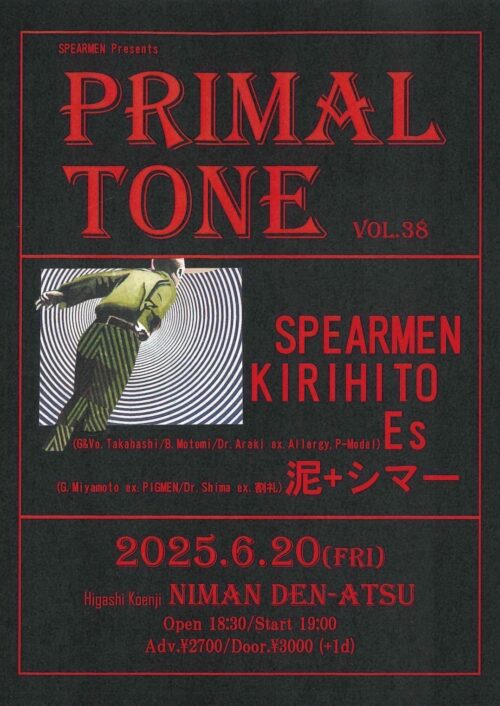 LIVE 21 6月 2025 2025.06.20(Fri) – PRIMAL TONE – Vol.38 at Higashi-Koenji 二万電圧 『PRIMAL TONE Vol.38』SPEARMEN企画2025.6.20(Fri) at 東高円寺 二万電圧SPEARMENKIRIHITO泥+シマー (メ/宮本PIGMEN、島ex割礼)Es(B exGangInBlue、Dr exAllergy、P-Model)open.18:30 start.19:00adv.2,700yen door.3,000yen(+1d 600yen) info:東高円寺 二万電圧 KIRIHITO