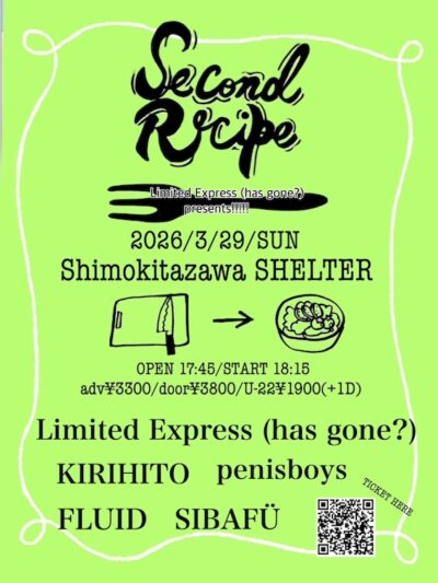 LIVE 09 3月 2026 2026.03.29(SUN) -Limited Express (has gone?) presents Second Recipe- 2026/03/29 (SUN) OPEN 17:45 / START 18:15 -Limited Express (has gone?) presents Second Recipe- Limited Express (has gone?) FLUID KIRIHITO SIBAFÜ… KIRIHITO